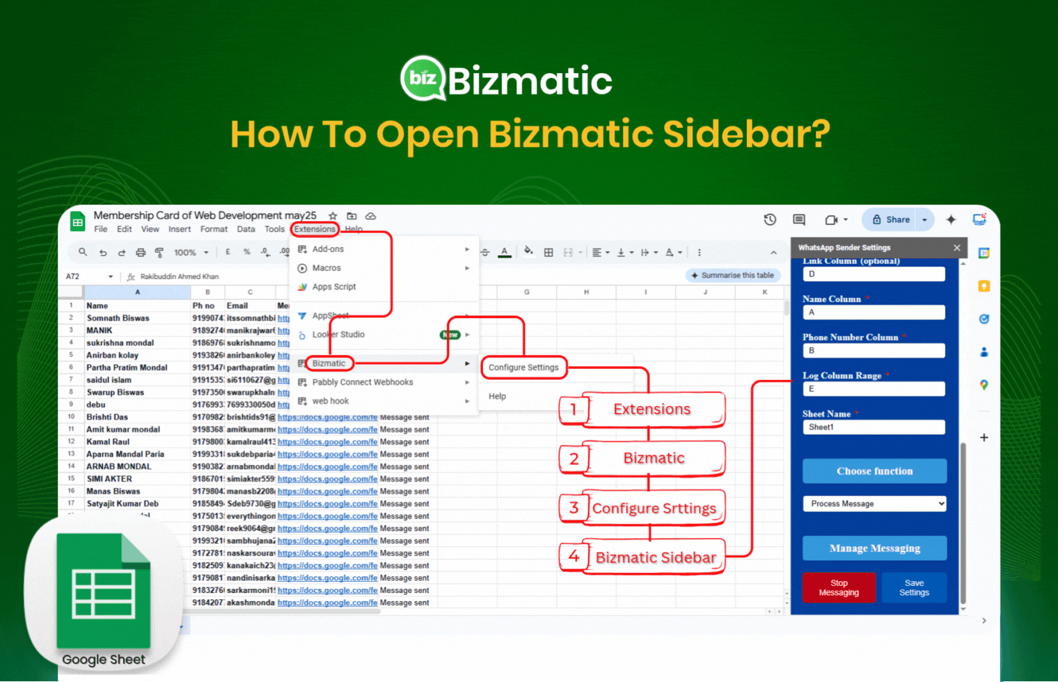 WhatsApp your customers directly from Google Sheets with this Bizmatic app + Google Sheet + Bizmatic add-on!